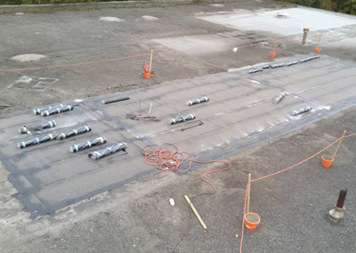 In order to apply the system effectively, every single mounting platform for each telephone mast and item of ancillary services equipment had to be released vertically their mountings and jacked up using air bags in order to apply the liquid membrane and substrate properly.