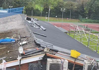 Capping sheets, raised upstands on the perimeter of the roof, a new gutter and fascia boards were installed to complete the installation.